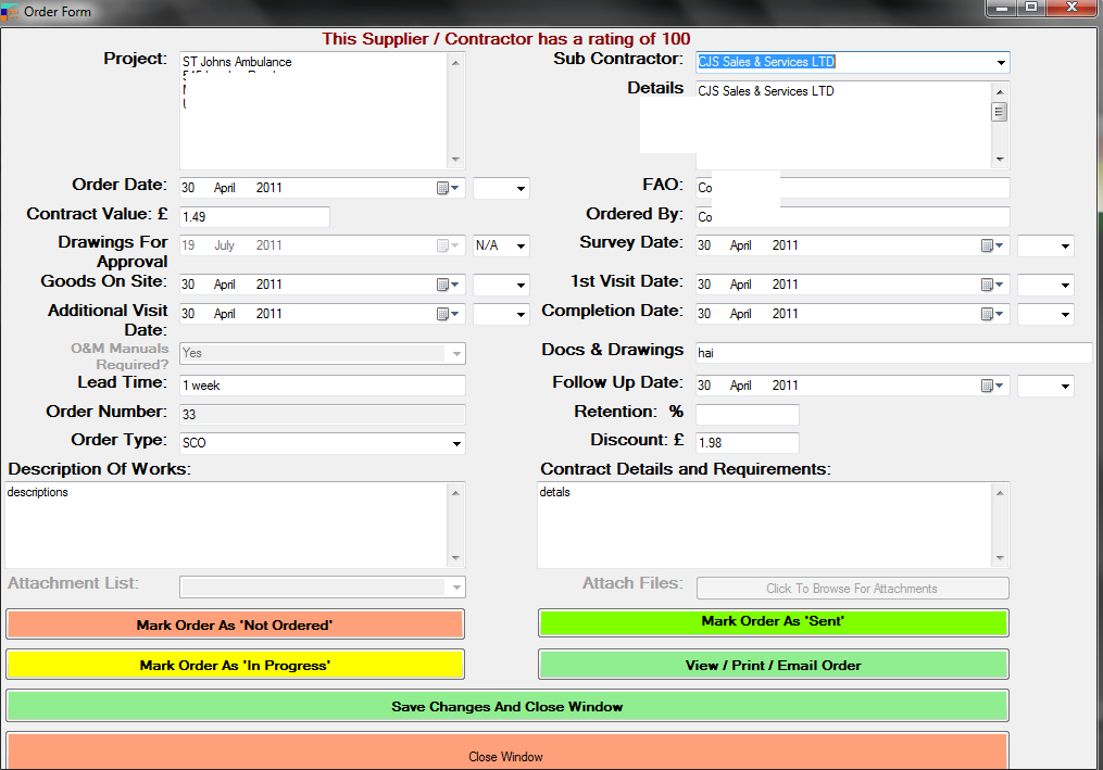 Sub Contract Order Form accessed through the Project Summary. The Sub Contract Order Form will print and attach to a Bundle of materials [to be agreed drawings etc] as a PDF/attachment to email. The physical order will be processed manually. Once the Order Form is complete, printed and sent to supplier. The user would select update Project Summary to update the Sub Contract Order Status on the Project Summary.