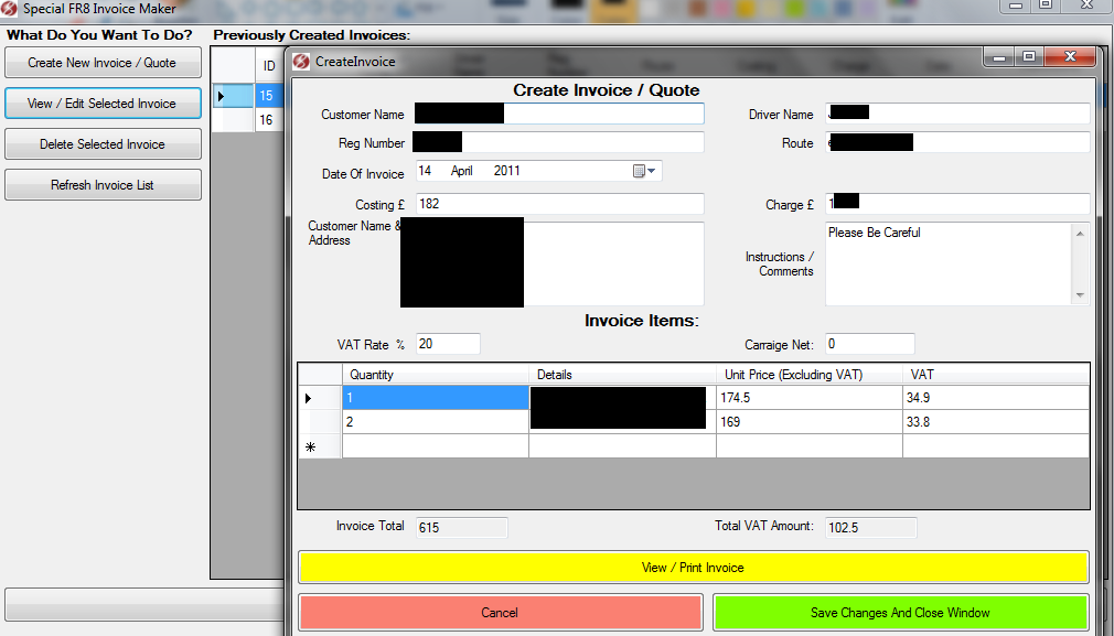 This is a small piece of software made for shipping company Special Fr8 Europe that allows them to quickly create invoices for their customers. It allows all users on the network to view a centralised list of previously created invoices. It also allows them to create new invoices, and save or print them. It automatically calculates VAT and totals, and generates the invoices based on the user input in the proper layout.